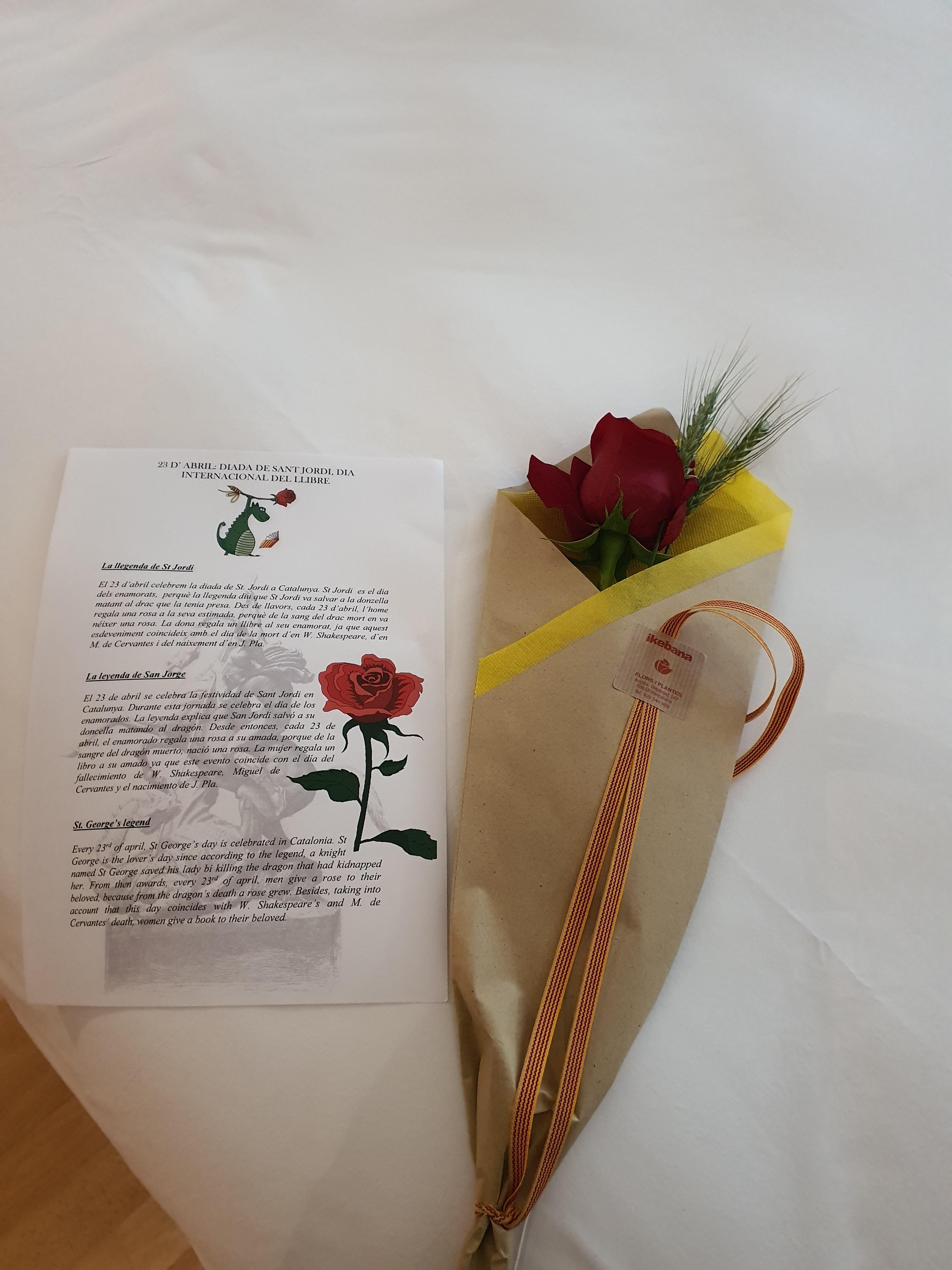 오늘은 상 조르디의 날 일명 국제 책의 날이라 책도 팔고 장미도 들고다니는 축제같은 날 기념으로 장미꽃과 그에 대한 설명 브로셔를 침대 위에 제공해주셨다.