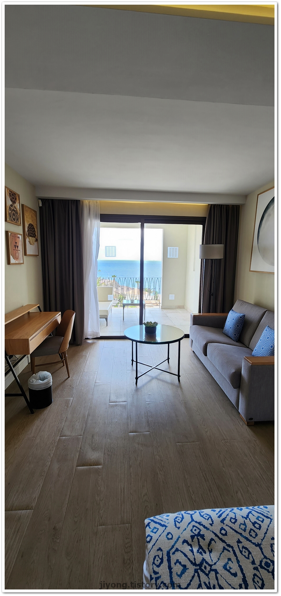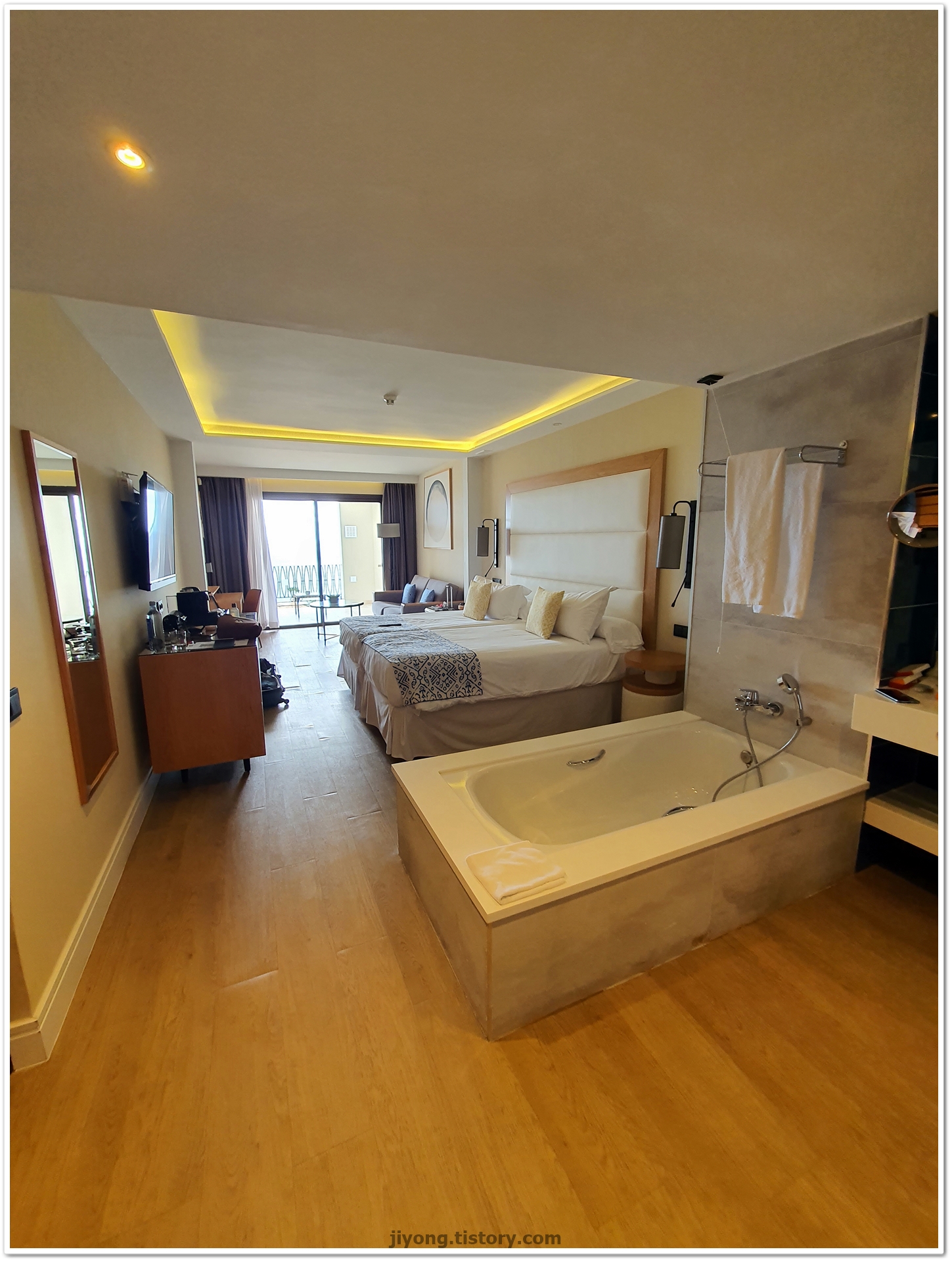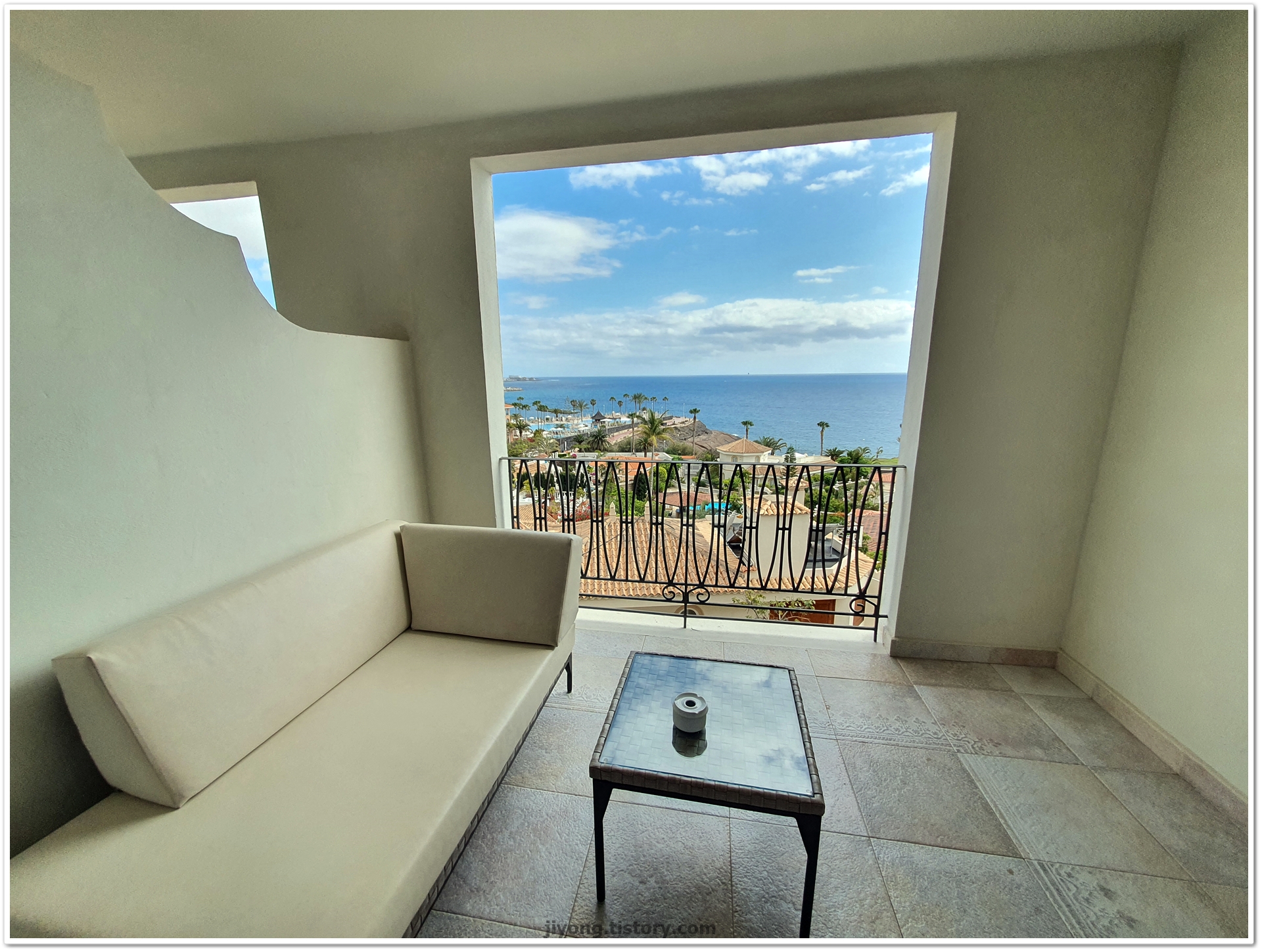욕조와 침대를 지나쳐 테라스로 향해서 본 전망이 이곳이 휴양지구나 싶었다.