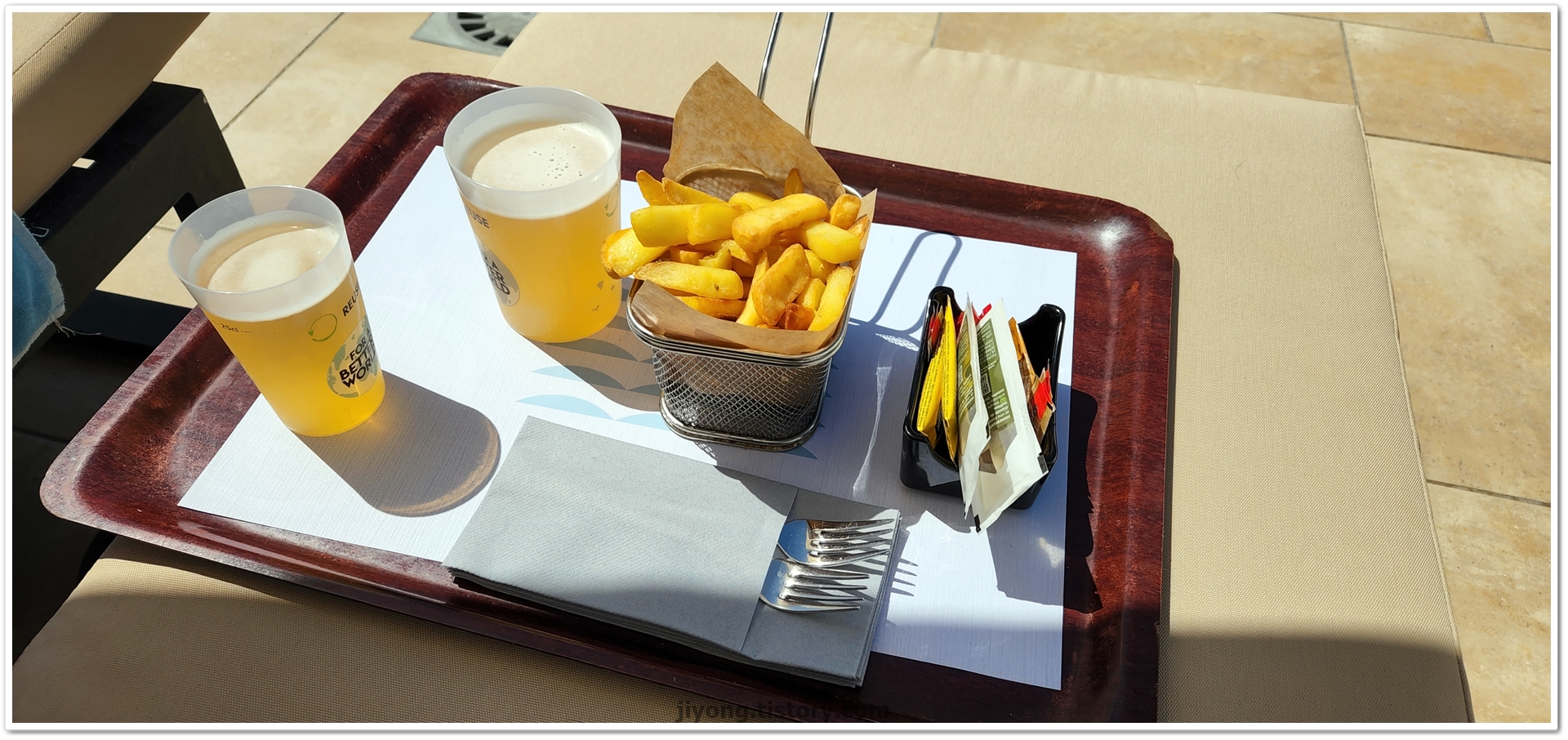 바에서 맥주 2잔과 감자튀김을 시켰다.