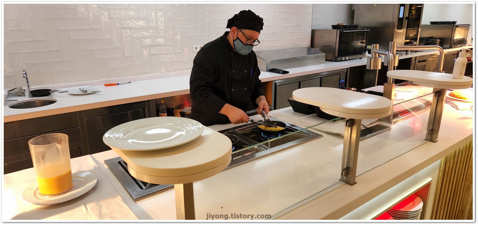 셰프에게 이야기하면 오믈렛을 원하는 스타일로 재료 넣어서 만들어주신다