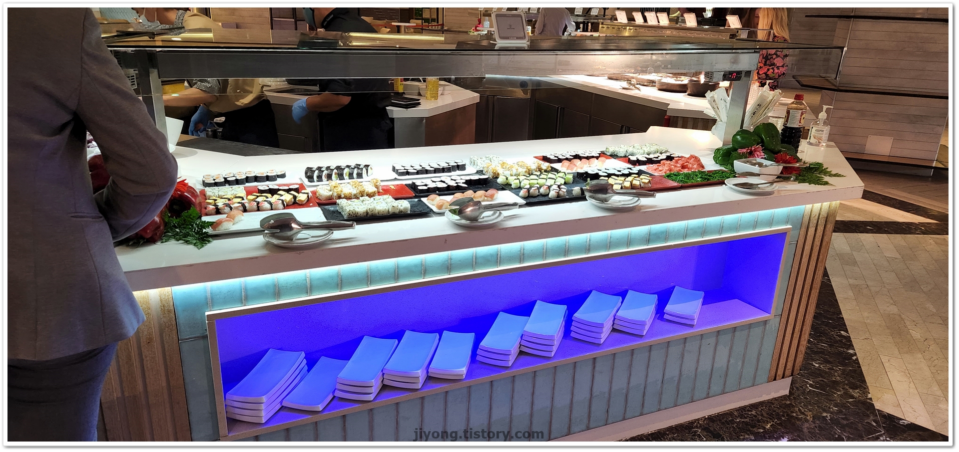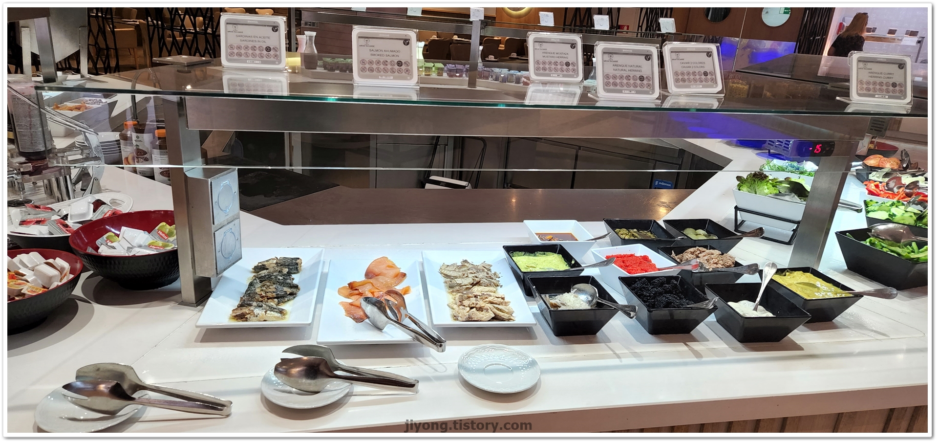 연어와 캐비어들도 준비되어 있다. 캐비어도 2~3종류 색상별로 준비되어 있다.
