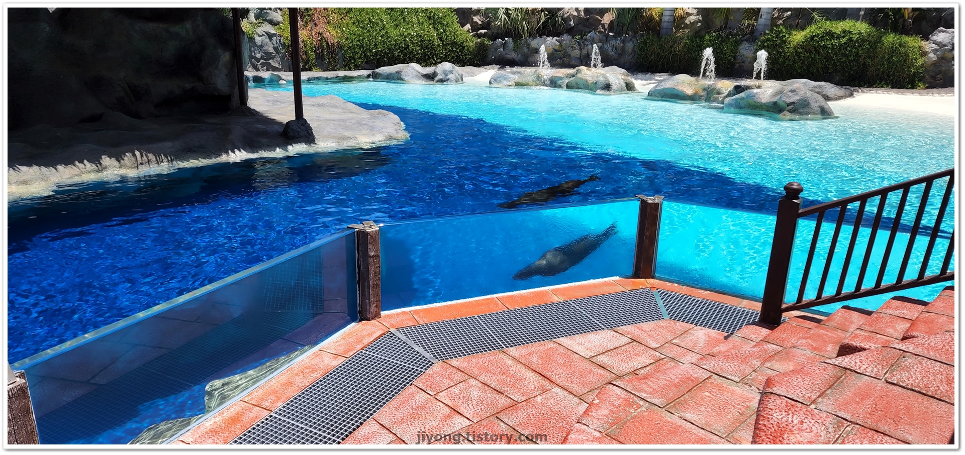 옷을 갈아입고 입구 쪽으로 나오다가 묘기를 부리는 물범들을 보았다.