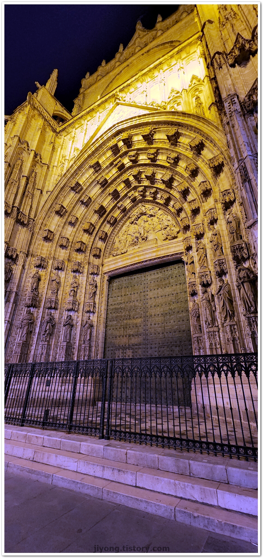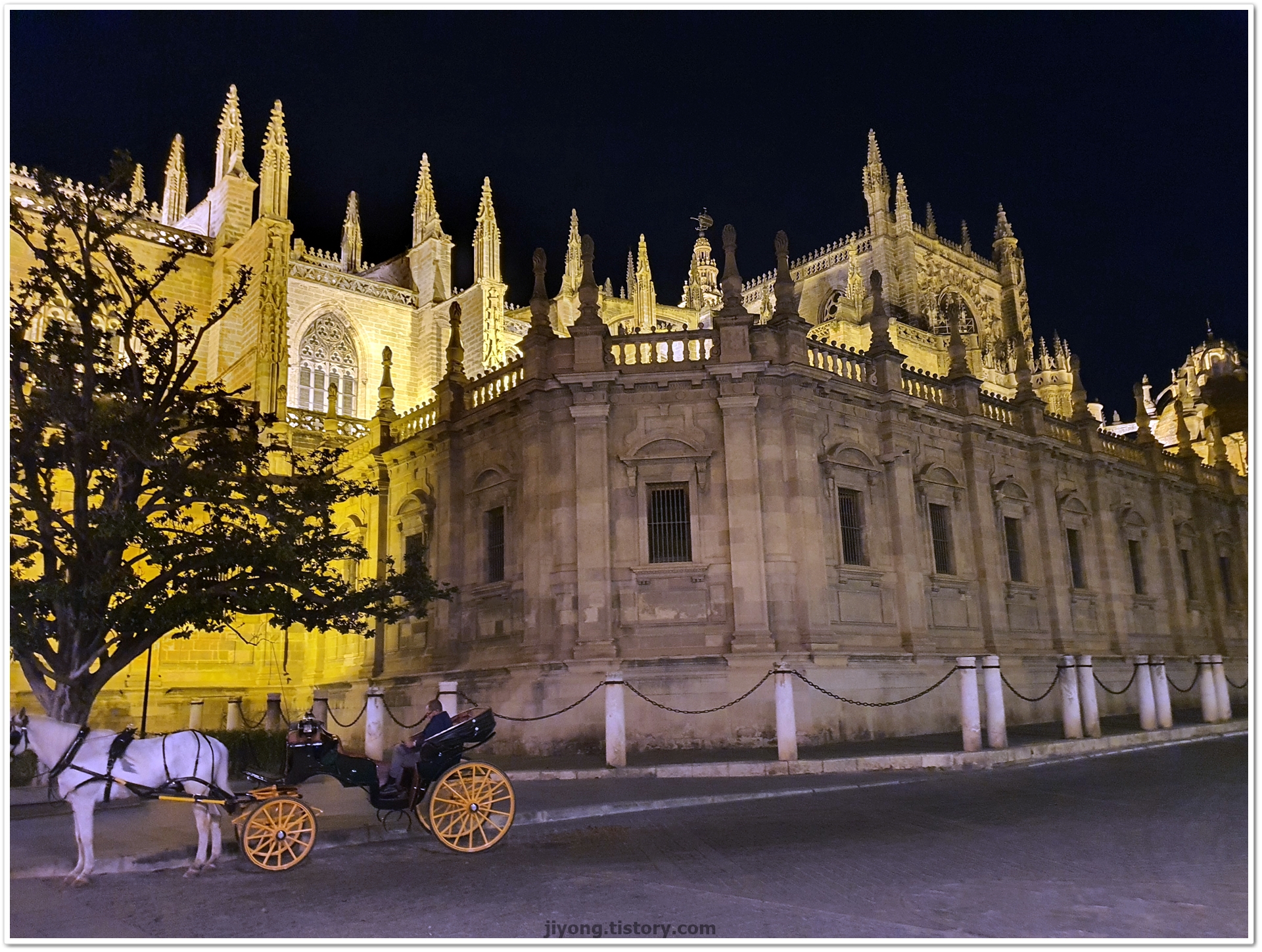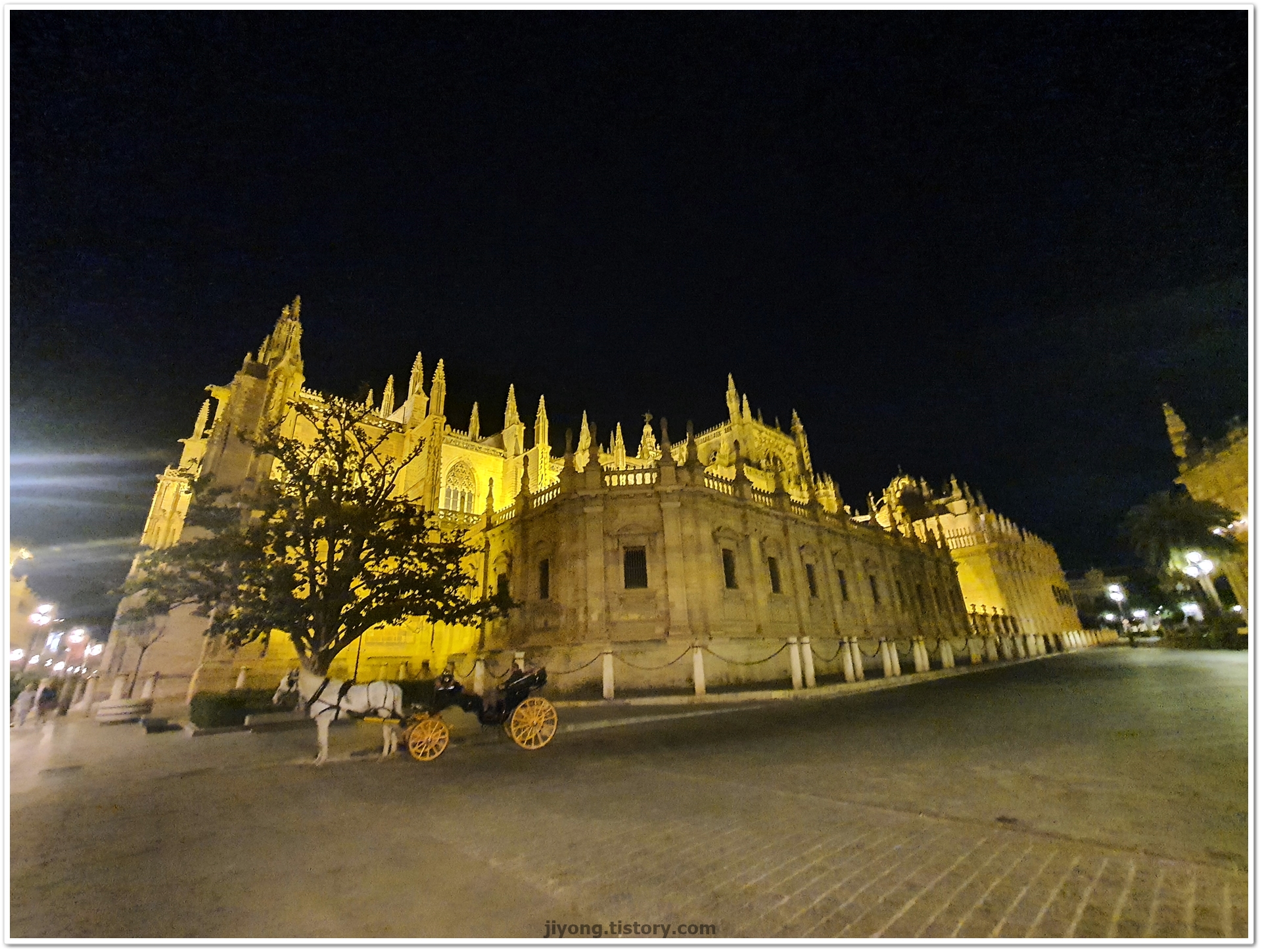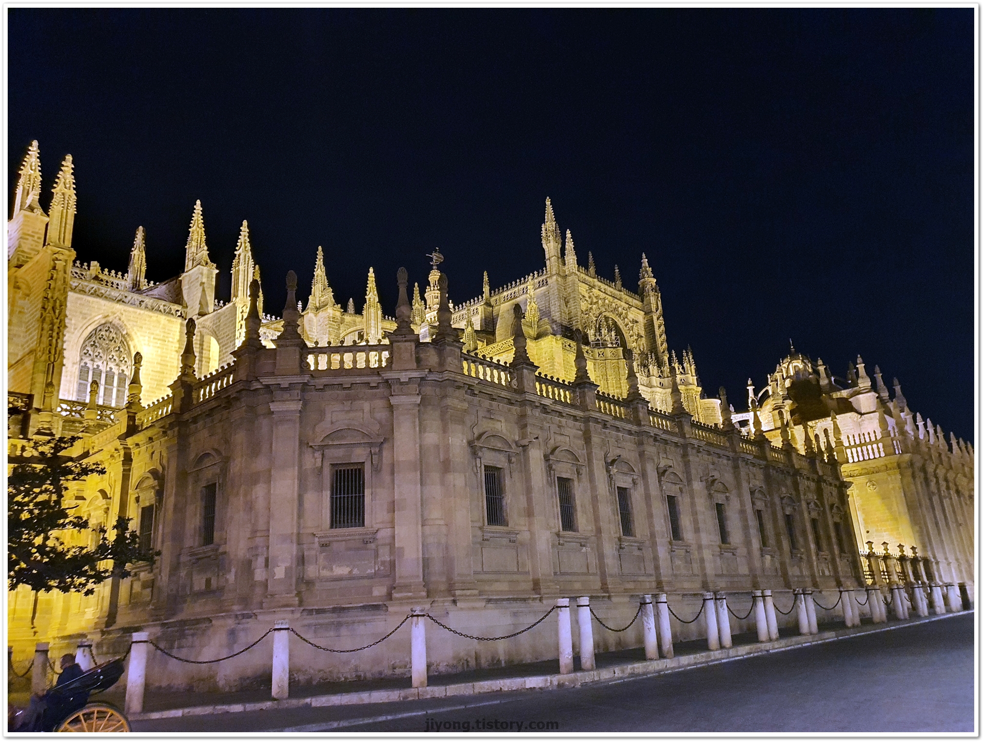 밤의 세비야 대성당의 조명이 켜지면 이렇게나 웅장하고 아름답게 보인다.