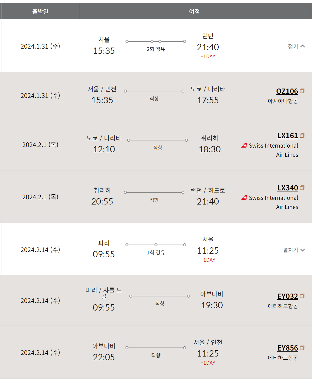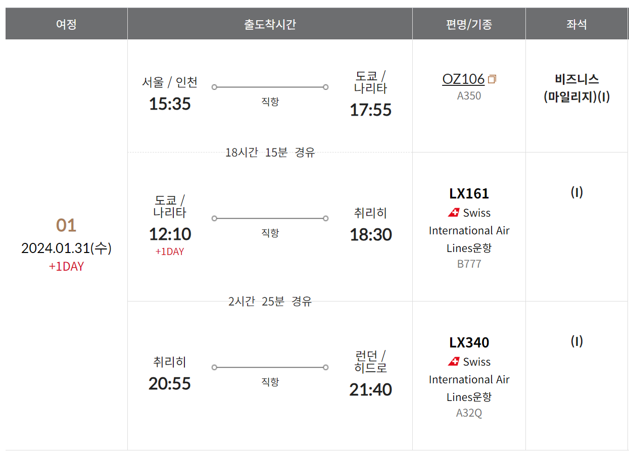 결국 찾아낸 나리타에서 1박하고 취리히 거쳐 런던행 완성 예약 완료
