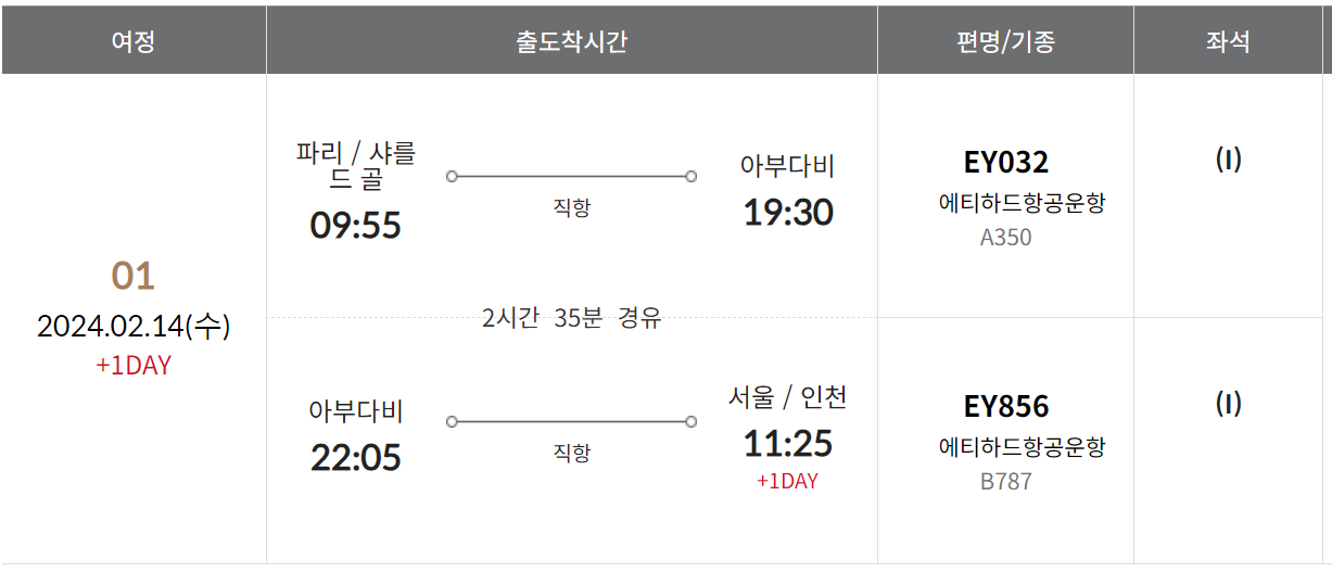 파리에서 아부다비 에티하드항공을 이용하여 인천으로 입국 예약 완료